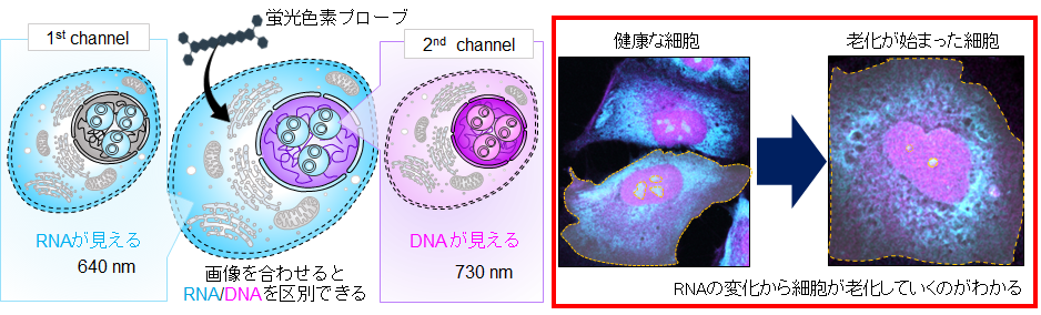 図: 細胞に無害な赤色光~近赤外光を2種類用いて励起することにより細胞内でDNAとRNAを同時に見分ける(左)と細胞が老化していくのがわかる(右)