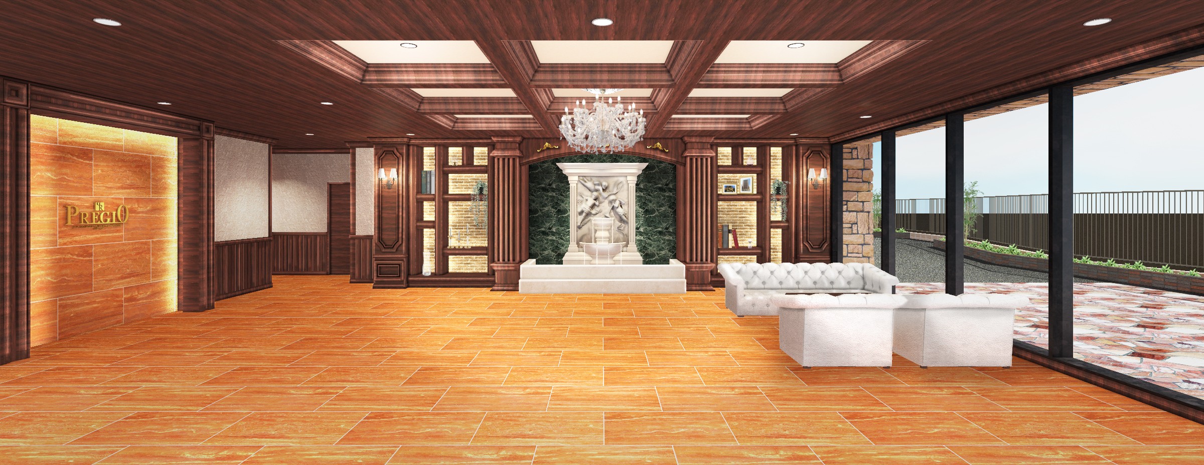 「PREGIO」ブランドが誇るエントランスホールは、訪れるすべての人を上質な空間へ誘います。木目調の天井と大理石調の床が醸し出す温かみと、中央に輝くシャンデリアの華やかさが、洗練された雰囲気を演出します。中央の噴水から流れる水音と大きな窓から差し込む自然光が空間に癒しをもたらし、訪問者に快適なひとときを提供します。