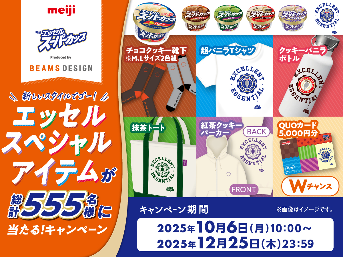 「明治 エッセル スーパーカップ 紅茶クッキー」の発売を記念して、BEAMS DESIGN監修のエッセルスペシャルアイテムが総計555名様に当たるキャンペーンを実施します。