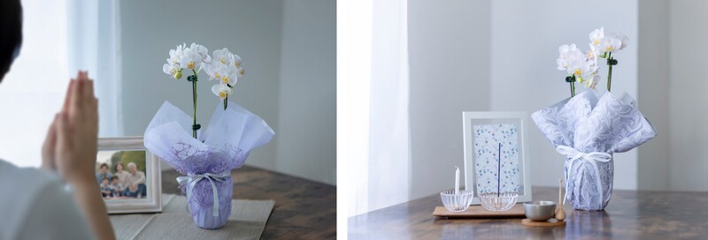 「胡蝶蘭 偲び花」は、仏壇のない現代の住まいにも自然に調和するコンパクトな胡蝶蘭ギフトです。高さ約30cmの小ぶりなサイズはリビングやメモリアルコーナー、故人の写真のそばにも飾りやすく、お悔やみ感を強調しすぎない洗練されたデザインが特長です。遠方に住む親族や、形式にとらわれず故人を偲びたい方、ペットと暮らすご家庭、香りに敏感な方、高齢者や植物初心者など、幅広い層に向けて開発されました。回忌法要や命日、お盆といった節目はもちろん、故人の誕生日や日常でふと偲ぶひとときにも寄り添い、香りが控えめで育てやすいため、どなたにも安心して贈ることができます。大切な想いを花に託し、暮らしの中にさりげない祈りを届ける、新しいお悔やみのかたちです。 「胡蝶蘭 偲び花 銀の祈り」は上品で高級感を大切に仕上げ、「胡蝶蘭 偲び花 淡紫の祈り」はカジュアルな雰囲気を意識しました。贈る相手やシーンに合わせて選べます。