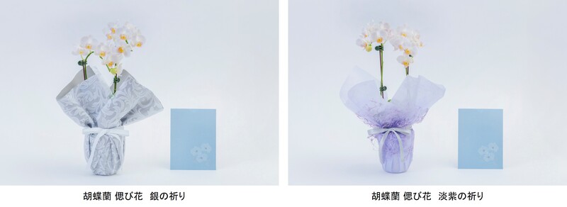 商品名 :「胡蝶蘭 偲び花 銀の祈り」、「胡蝶蘭 偲び花 淡紫の祈り」