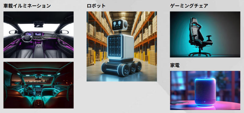 自動車内装(アンビエントライト、ドアトリム、センターコンソール等)をはじめ、家電、ロボット、ゲーミングチェア、インテリア照明、建築資材など、幅広い分野での活用が可能です。