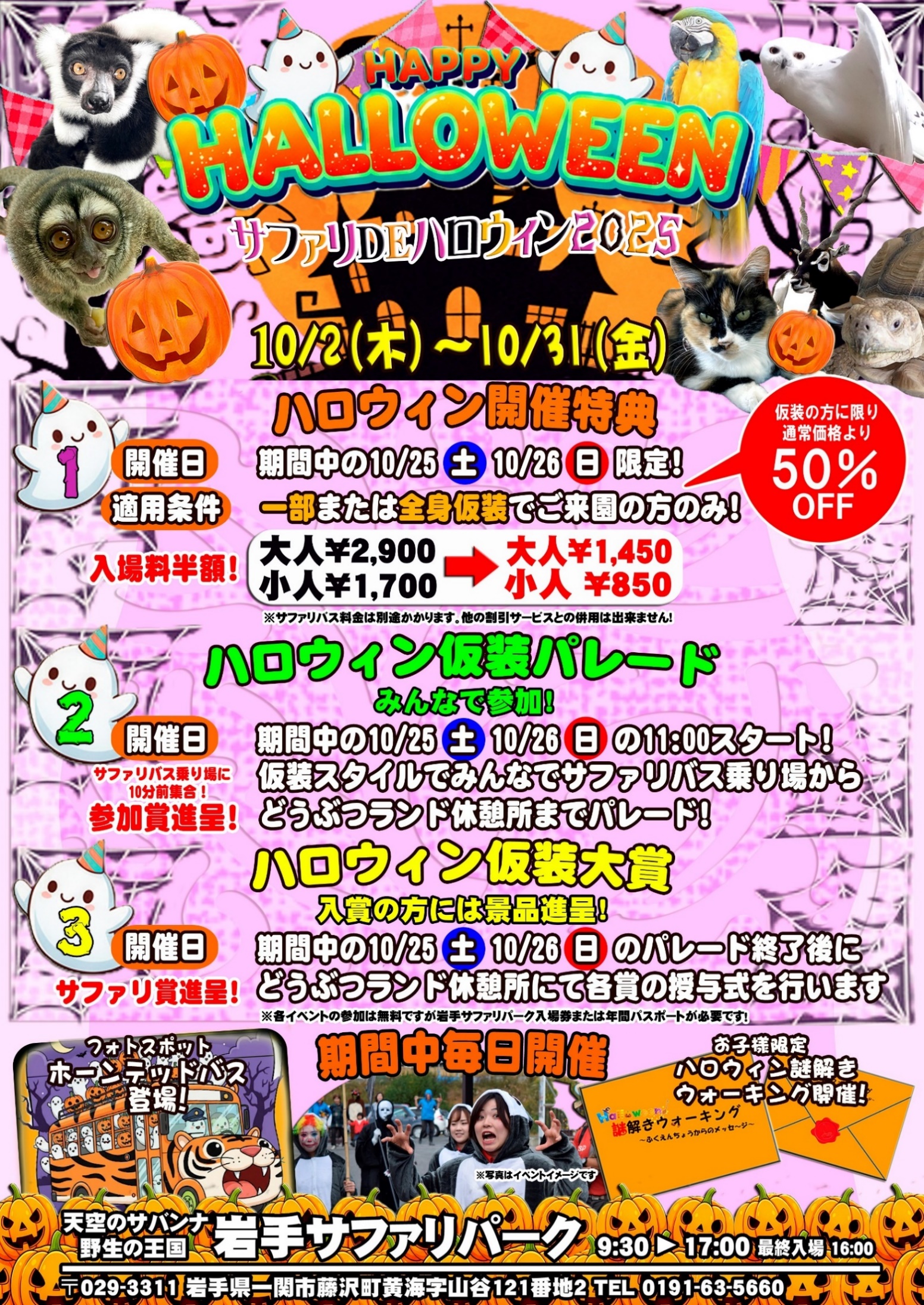 10月2日(木)から10月31日(金)まで「サファリDEハロウィン2025」と題して、フォトスポット・ホーンテッドバスの設置やお子様限定謎解きウォークを開催、10月25日(土)と10月26日(日)の2日間に限り一部仮装、全身仮装でご来園のお客様は入場料金がなんと半額になります。また、同日限定で仮装パレードと仮装大賞を開催します。ようやく酷暑も去って、過ごしやすくなった岩手の秋を皆で楽しみましょう!