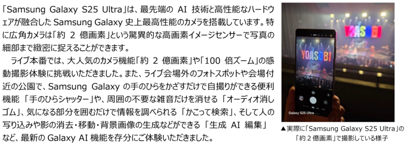 Q.Samsung Galaxy S25 Ultra」でライブの思い出を美しく写真に残し、ライブ中だけでなくライブ後も思い出に浸っていただけますが、この点についてはいかがでしょうか?