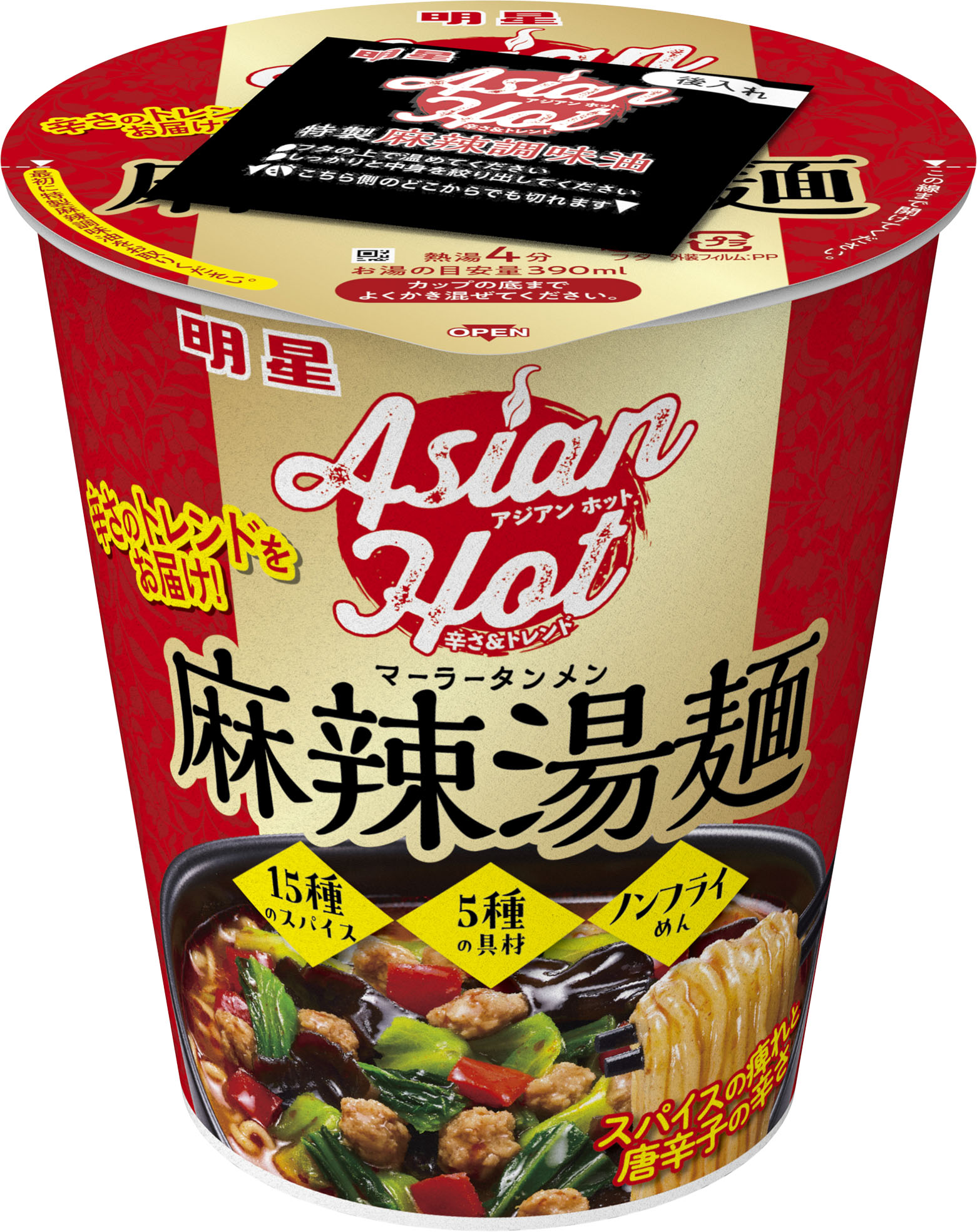 シリーズ第1弾は、「明星 Asian Hot 麻辣湯麺」。麻辣湯麺は日本でも専門店が続々出店し連日行列ができるほどの人気で、20~30代からも絶大な支持を集めています。このトレンドの味である 「明星 Asian Hot 麻辣湯麺」 は、牛と豚をベースに豆板醤等で味を調え、ジンジャー・ガーリック・コリアンダー等の15種のスパイスを使用し、さらに花椒 (ホワジャオ) の香りが広がる特製麻辣調味油で仕上げる麻辣湯スープに、豚肉ダイス・チンゲン菜・キャベツ・きくらげ・赤ピーマンという彩りのよい5種の具材を使用しています。麺はスープによく合う明星独自のノンフライめんです。