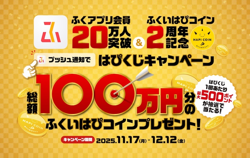 ふくアプリ会員20万人突破 総額100万円分のはぴコインが当たる記念キャンペーンを実施