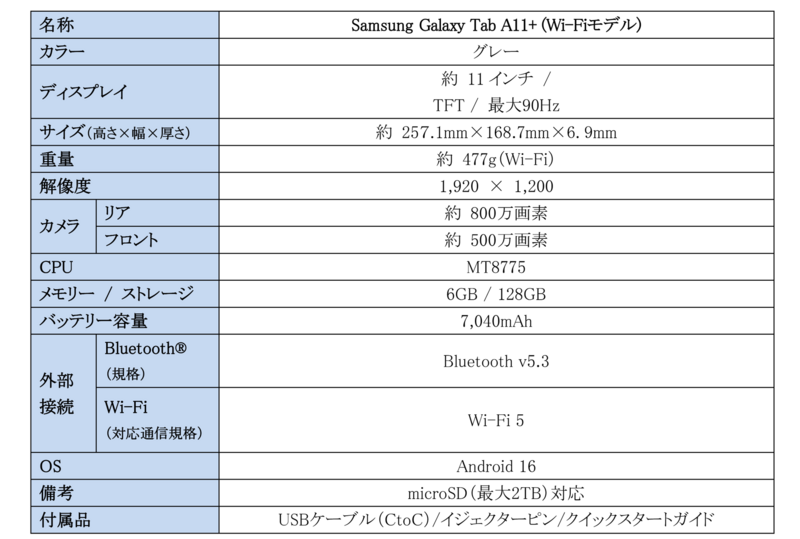 <主な仕様:「Samsung Galaxy Tab A11+ (Wi-Fiモデル)」>