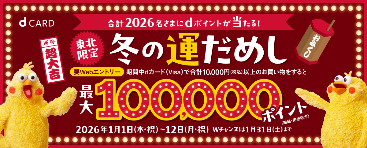 | 名称 | 第一弾:【東北限定2025】冬の運だめしキャンペーン 第二弾:【東北限定2026】冬の運だめしキャンペーン Wチャンス:東北限定!dカード(Visa)Wチャンスキャンペーン |