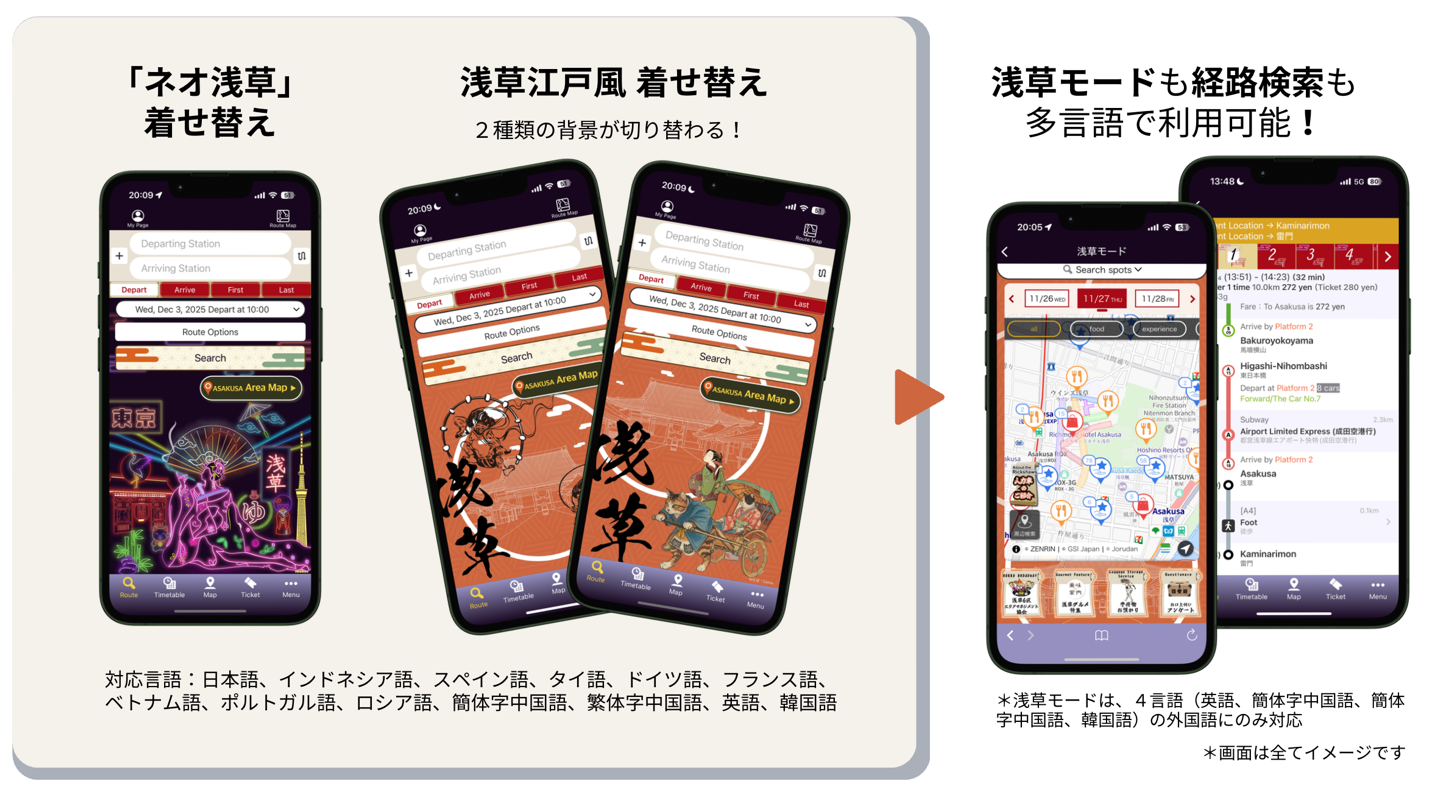 また、Webサイト上でも「浅草モード」を展開することで、「乗換案内」アプリを利用していない方や海外からの訪問者にも、情報取得から経路検索までをワンストップでご提供します。