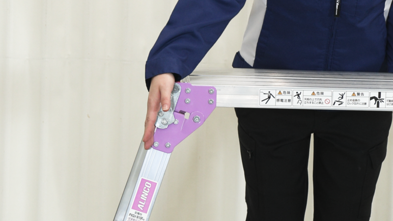 足場台を完全に開き、止め金具をロックしている様子