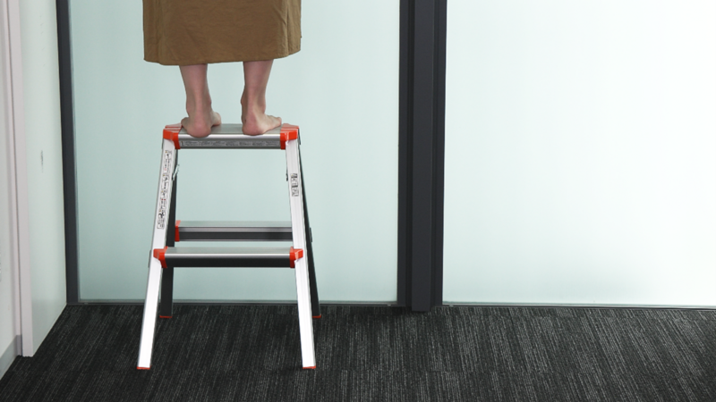 踏み台を移動せずに身を乗り出す様子 つま先立ちをして足場台を使用している様子