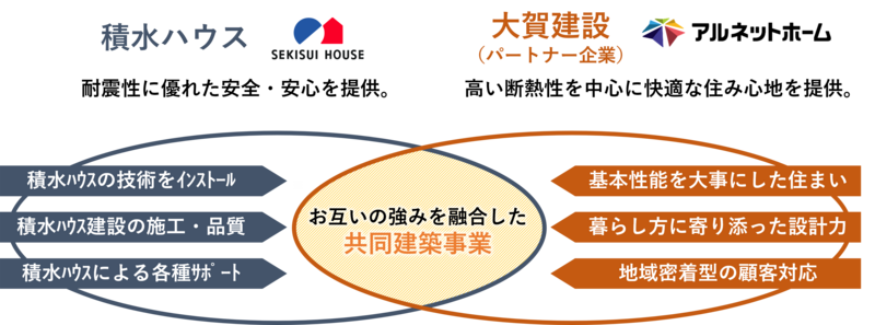SI事業では、パートナー企業の販売手法や外装・内装・設備の独自性が確保され、かつ積水ハウスグループによる施工が伴う点でフランチャイズとは異なります。お客様と契約し、保証やアフター対応を行うのはパートナー企業です。積水ハウスはSI事業を通じ、オリジナルの耐震技術「ダイレクトジョイント構法(DJ構法)」や「積水ハウス建設による高精度な施工」、「高強度耐力壁」などの技術力や高い耐震性、また4号特例の縮小に対応し、全棟の許容応力度による構造計算を提供いたします。そしてアルネットホームブランドを展開する大賀建設では、創業46年間で累計10,000棟以上の注文住宅をお引渡ししてきた実績を活かし、地域特性を理解した「高い断熱性能」を始めとした基本性能の高さと、家事動線やキッズ動線などの暮らしを豊かにする家づくりを提供いたします。お客様に安全性と快適性を両立した新たな選択肢を提供し、良質な住宅ストックの形成に貢献してまいります。