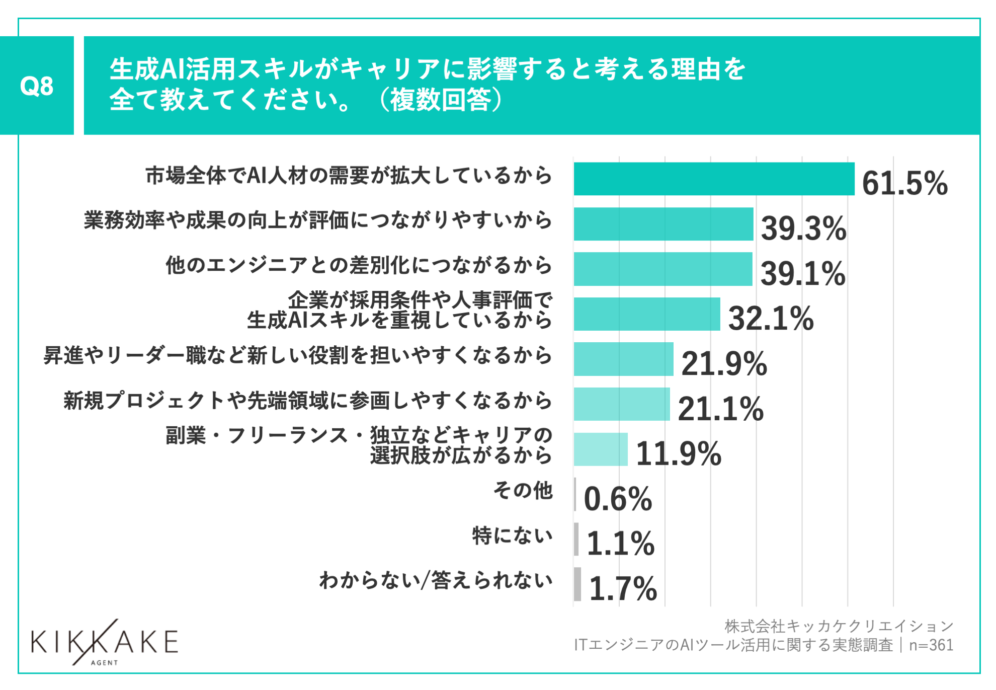 Q6で「非常に大きく影響する」「やや影響する」と回答した方に、「Q8.生成AI活用スキルがキャリアに影響すると考える理由を全て教えてください。(複数回答)」(n=361)と質問したところ、「市場全体でAI人材の需要が拡大しているから」が61.5%、「業務効率や成果の向上が評価につながりやすいから」が39.3%、「他のエンジニアとの差別化につながるから」が39.1%という回答となりました。