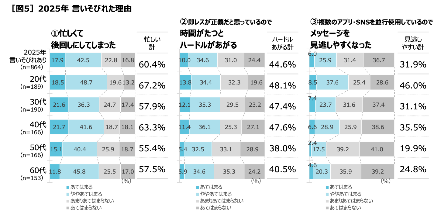 2025年に言いそびれがある人に、言いそびれにつながってしまう理由を聞くと、「忙しくて後回しにしてしまった」(60.4%=あてはまる17.9%+ややあてはまる42.5%)が多いものの、20代では「即レスが正義だと思っているので、時間がたつと返す・伝えるハードルがあがる」(48.1%=あてはまる13.8%+ややあてはまる34.4%)や「メッセージアプリや複数のSNSを並行して使っているので、メッセージを見逃しやすくなった」(46.0%=あてはまる8.5%+ややあてはまる37.6%)が他の年代に比べて多いのが目立ち、これからも言いそびれの理由として増えていきそうです[図5]。