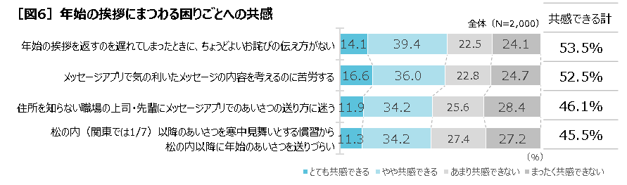 季節の挨拶をする頻度が増える年末年始。全員に年始の挨拶での困りごとへの共感を聞くと、「年始の挨拶を返すのを遅れてしまったときに、ちょうどよいおわびの伝え方がない」(53.5%=とても共感できる14.1%+やや共感できる39.4%)、「メッセージアプリで気の利いたメッセージの内容を考えるのに苦労する」(52.5%=とても共感できる16.6%+やや共感できる36.0%)、「住所を知らない職場の上司・先輩に、メッセージアプリでの挨拶の送り方に迷う」(46.1%=とても共感できる11.9%+やや共感できる34.2%)、「松の内以降の挨拶を寒中見舞いとする慣習から、松の内以降に年始の挨拶を送りづらい」(45.5%=とても共感できる11.3%+やや共感できる34.2%)といった困りごとが見られました[図6]。