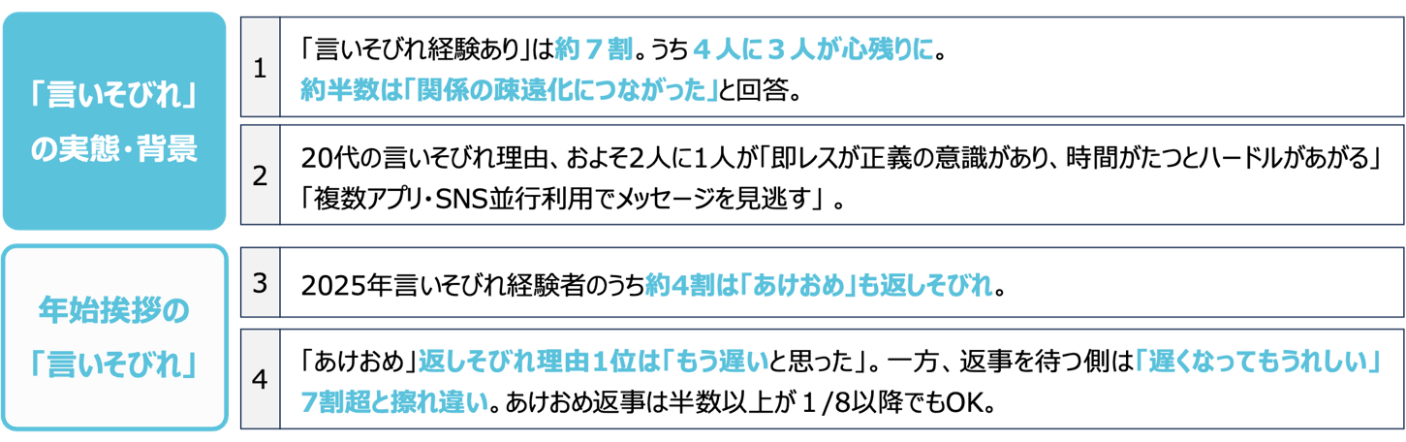 「言いそびれやコミュニケーションについての実態調査」 感謝・おわび・季節の挨拶など「言いそびれ」が人間関係を変える? 7割が経験、約半数は『疎遠に…』 年賀状など年始の“あけおめ(明けましておめでとう)”言いそびれはしっかり清算を! 7割超は『(あけおめの返信は)遅れてもうれしい』と回答 ― 年明けに広がる“新・松の内”が明らかに