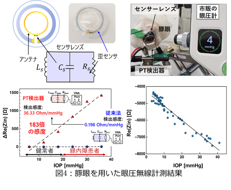 早稲田大学大学院情報生産システム研究科三宅 丈雄(みやけ たけお)教授アズハリ・サマン次席研究員らの研究グループと山口大学大学院医学系研究科眼科学講座の木村 和博(きむら かずひろ)教授、芦森 温茂(あしもり あつしげ)助教らの研究グループは、導電性高分子(PEDOT:PSS)と接着性高分子(PVA)からなる多層構造抵抗センサと、PT対称性の原理を利用した無線検出器を組み合わせることで、眼圧※1変化に応じた抵抗変化を高いQ値※2で読み取ることに成功しました。