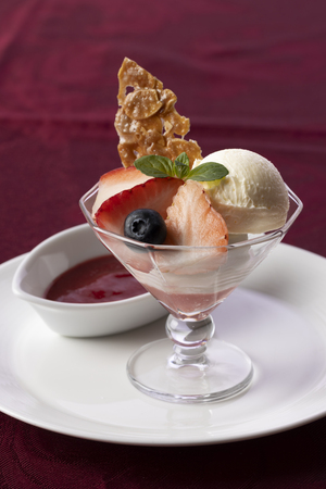苺を華やかに盛り付けたスペシャルデザート。苺のジュレにクレームダンジュ※を重ねた一品です。ラズベリーと苺、アプリコットを合わせたソースをかけてお楽しみいただきます。