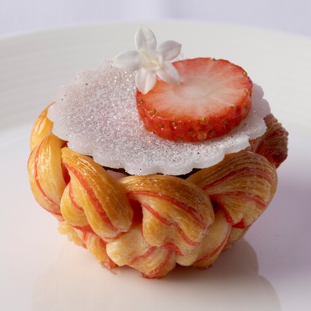 柚子をきかせた白い泡のジュレがくちどけ軽やかなタルト。中には柚子でマリネした苺と、苺のコンフィチュールが入っています。甘酸っぱくさっぱりとした味わいの一品です。