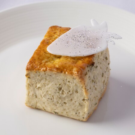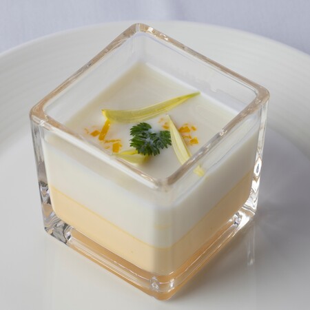 筍が入った和出汁ベースのフランに、柚子の香りが爽やかな白アスパラガスのヴルーテ※を重ねた、二層仕立ての冷製スープ。季節の味わいを感じる春らしい一品です。