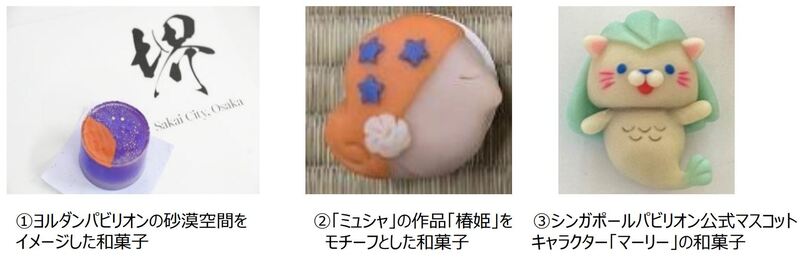万博会場における堺市主催催事で取り入れた現代アーティストの茶器を使用した呈茶を開催します。ヨルダンパビリオンでの「乾坤(けんこん)茶会」にて提供された「御菓子司 天神餅」製の同パビリオンの砂漠空間をイメージした和菓子をお楽しみいただけます。
